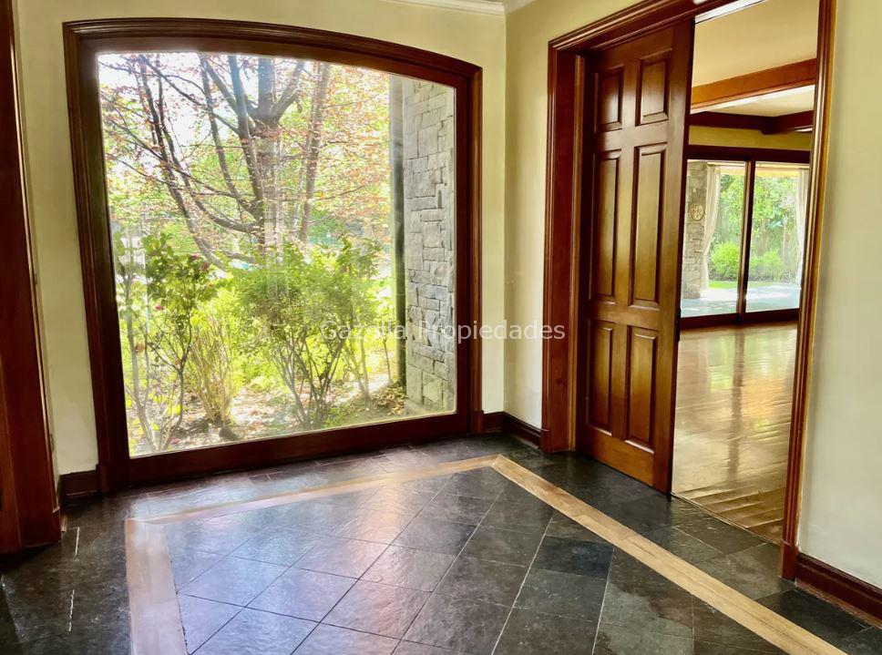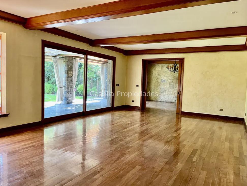 Hall de entrada, escritorio, baño de visita, gran living, amplio comedor con espacio para 14 personas, ambos con salida a terraza techada, todas las puertas, ventanas y vigas son de madera de cedro sólido.