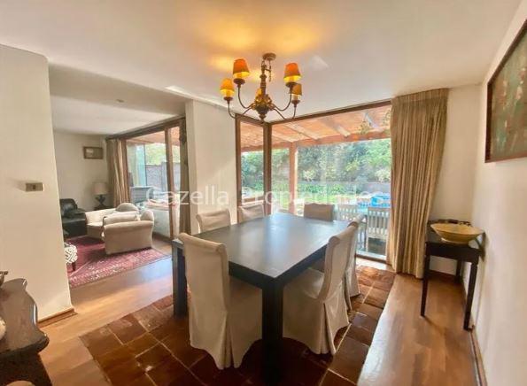 Ubicada en condominio en San Carlos de Apoquindo, esta casa ofrece orientación norte y seguridad. Cuenta con recibos amplios, living y comedor separados, ambos conectados a una terraza techada. El dormitorio principal es en suite y dispone de walk in closet, además de baño de visita.