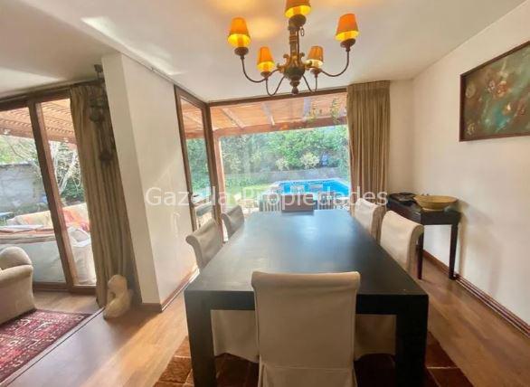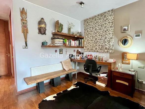 El exterior destaca por un jardín privado, piscina y quincho. La calefacción es por loza radiante y radiadores. El inmueble incluye dos estacionamientos y espacio para visitas. El valor del arriendo es UF 105 y el arriendo amoblado es UF 120. Los gastos comunes son de $180.000.- Número de dormitorios:
